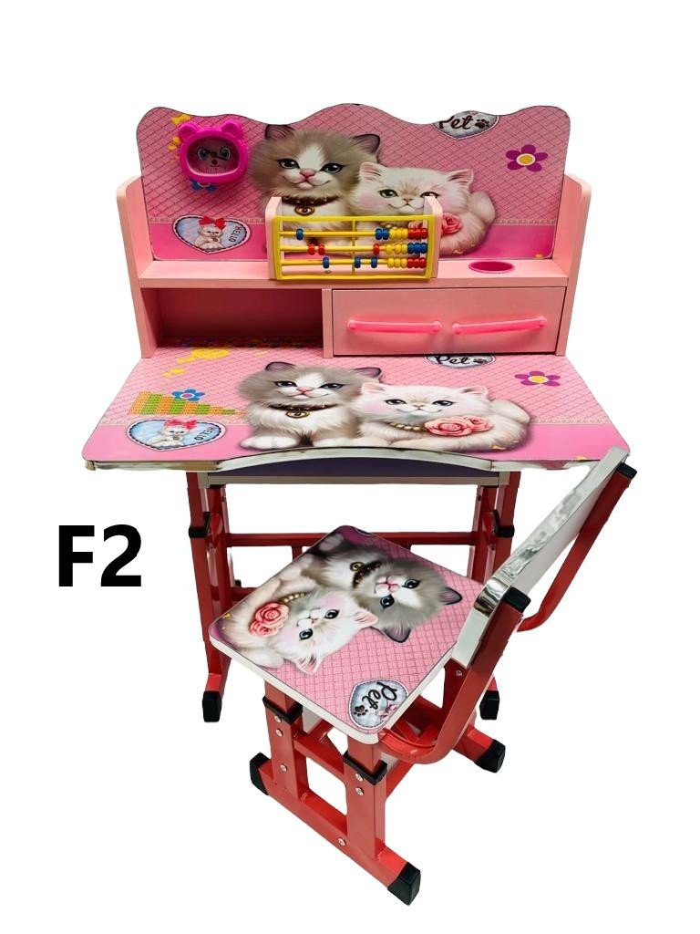 Birou cu Scaun Pentru Copii, Model F2, Imprimeu Pisici, cu Polita si Sertar, Numaratoare si Ceas, 01350CLT