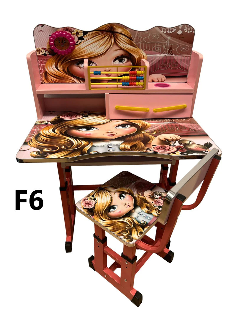 Birou cu Scaun Pentru Copii, Model F6, Imprimeu Fetita, cu Polita si Sertar, Numaratoare si Ceas, 01350CLT
