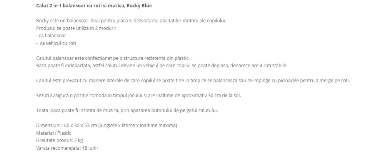 Calut 2 in 1 balansoar cu roti si muzica, Rocky Blue Rocky este un balansoar ideal pentru joaca si dezvoltarea abilitatilor motorii ale copilului. Produsul se poate utiliza in 2 moduri: – ca balansoar – ca vehicul cu roti Calutul balansoar este confectionat pe o structura rezistenta din plastic. Baza poate fi indepartata, astfel calutul devine un vehicul pe care copilul se poate deplasa, deoarece are 4 roti stabile. Calutul este prevazut cu manere laterale de care copilul se poate tine in timp ce se balanseaza sau se impinge cu picioarele pentru a merge pe roti. Sezutul asigura o pozitie comoda in timpul jocului si are inaltime de aproximativ 30 cm de la sol. Toata joaca poate fi insotita de muzica, prin apasarea butonului de pe gatul calutului. Dimensiuni: 60 x 30 x 53 cm (lungime x latime x inaltime maxima) Material : Plastic Greutate produs: 2 kg Varsta recomandata: 18 luni+ Mentiune: Vanzatorul face eforturi permanente pentru a pastra acuratetea informatiilor din acesta pagina. Rareori acestea pot contine inadvertente: Imaginile folosite si textele de pe SITE au caracter informativ și pot varia sau diferi ocazional față de caracteristicile produselor prezentate. Toate promotiile prezente in site sunt valabile in limita stocului.