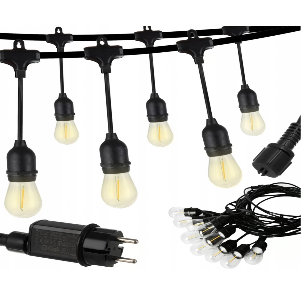 Creeaza o atmosfera romantica si relaxanta cu ajutorul ghirlandei luminoase cu pendule! O poti folosi atat in interior, precum in restaurante, dar si in exterior, in spatii precum gradina, terasa sau la evenimente i Instalatie LED Ghirlanda Luminoasa cu 10 Becuri Vintage Clare cu LED-uri lumina Alba foarte Calda – galbena 3000K, alimentare la priza 220V. Decoratiuni luminoase de terasa, gradina, pavilion, prelungibile, cu mufe interconectabile. Instalatia LED Ghirlanda este solutia perfecta pentru impodobirea casei sau terasei la interior sau exterior, avand un design placut cu 10 de becuri clare tip globuri alungite tip pendul cu filament LED, model Edison vintage. Cablu negru. Lumina: alb cald – galben, retro. Decorarea spatiilor la interior sau exterior: casa, curte, gradina, foisor, terase, balcon, restaurante, cluburi, cafenele, studiouri, dormitor etc. Becurile pot fi inlocuite si nu vor fi afectate daca un bec cedeaza. Cablu cu 10 becuri de ~2W fiecare. Lungime pendul ~ 12 cm Mai mult, ghirlanda functioneaza de la ~ -25 de grade si pana la ~ +50 de grade, ceea ce inseamna ca o poti folosi pe tot parcursul anului. Mentiune: Vanzatorul face eforturi permanente pentru a pastra acuratetea informatiilor din acesta pagina. Rareori acestea pot contine inadvertente: Imaginile folosite si textele de pe SITE au caracter informativ și pot varia sau diferi ocazional față de caracteristicile produselor prezentate. Toate promotiile prezente in site sunt valabile in limita stocului.