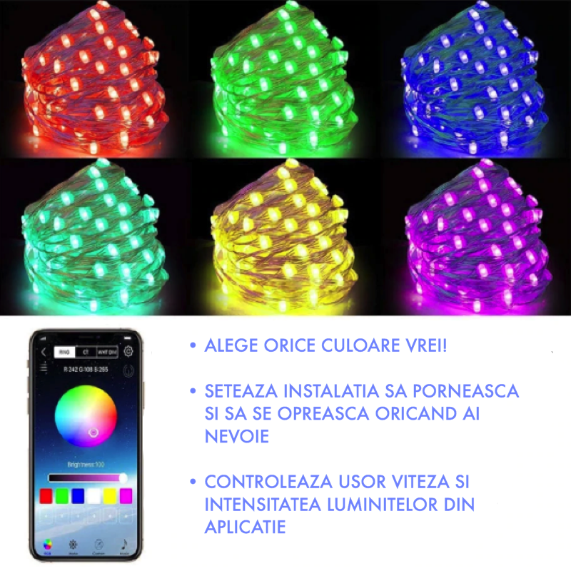 Decoreaza bradul cu instalatie de Cracriun RGB cu Control Bluetooth prin Aplicatie si alege culoarea care ti se potriveste cel mai bine!