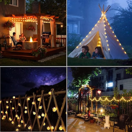 Aceasta instalatie se monteaza in exteriorul casei, dispunand de un mic panou solar care permite incarcarea pe timpul zilei si de un sensor de lumina, ce o face sa functioneze pe timpul noptii. Este ideala pentru orice anotimp si orice fel de eveniment: Craciun, Anul Nou, aniversari, nunti, botezuri, petreceri. Ghirlanda luminoasa solara este recomandata utilizarii in primul rand in spatii exterioare, dar poate fi folosita si in incaperi luminoase si insorite. Dispozitivul se alimenteaza cu energia provenita de la Soare, astfel nu-i necesara conexiunea la 220V. Acumulatorul integrat se incarca complet in timpul zilei in decurs de 6-8 ore si poate functiona pana in 4-5 ore (la prima utilizare se recomanda sa fie incarcat timp de 12 ore). Ideal pentru decorare: copaci, tufisuri, garduri, acoperisuri precum si pentru ferestre si brazi de Craciun. Este perfect pentru iluminatul cinei in gradina, ornamentarea la diverse evenimente. In perioada sarbatorilor de iarna instalatia are un rol deosebit de important pentru iluminarea locuintei, intrucat realizeaza un mediu ambiental primitor si calduros. Astfel, culoarea LED-urilor si numarul total de surse de iluminat sunt caracteristici care influenteaza aspectul final al acesteia. Instalatia are gradul de protectie IP44, se utilizeaza la exterior si are o durata de functionare de 6 – 8 ore. Aceasta nu necesita alimentare de la reteaua electrica, intrucat functioneaza doar cu ajutorul energiei solare si al acumulatorului incorporat. Acumulatorul este incarcat de elementul solar in timpul zilei, iar LED-urile lumineaza pe timp de noapte. Amplasand panoul la exterior, in locuri insorite, aceasta poate lumina pentru o perioada mai indelungata. Pozitionarea sa in locatii intunecoase poate influenta incarcarea acumulatorului si poate scurta durata de functionare a instalatiei pe timpul noptii. Temperatura de functionare: intre -20°C si + 60°C. * Mentiune: Vanzatorul face eforturi permanente pentru a pastra acuratetea informatiilor din acesta pagina. Rareori acestea pot contine inadvertente: fotografia are caracter informativ si poate contine accesorii neincluse in pachetele standard, unele specificatii sau pretul, pot fi modificate de catre producator fara preaviz sau pot contine erori de operare. Toate promotiile prezente in site sunt valabile in limita stocului. *