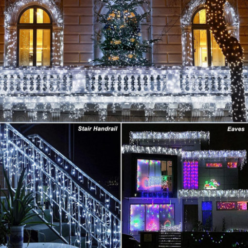 Instalatie Turturi 7035W, 300 LED-uri, Alb Rece, 12 metri, Interconectabil, Multiple Jocuri de Lumini, Tip Franjuri, de Exterior
