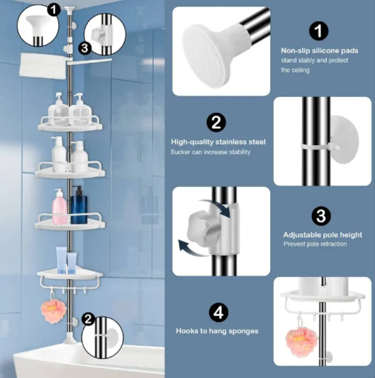 Organizator Multifunctional de Colt Multi Corner Shelf, Pentru Baie si Bucatarie, cu 4 etajere, inaltime 100-320 cm, ideal pentru lipsa de spatiu de stocare