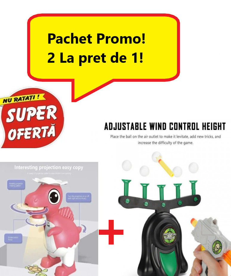 Set pistol si tinta cu aer DARK SHOT este conceput pentru tragere rapida si tintire precisa. Este perfect pentru practicarea abilitatilor de precizie, imbunatatirea concentratiei, coordonarii senzoriale si motrice. AVANTAJE, BENEFICII ȘI CARACTERISTICI Un joc distractiv care îi încântă atât pe cei mici cât și pe maturi Ideal pentru serile petrecute în familie Îmbunătățește coordonarea O idee originală de cadou Duze reglabile Dimensiuni: 33×9.5x32cm Greutate: 739g Material: PVC Comandă acum pistolul cu țintă zburătoare Un joc care va deveni o adevărată noutate pentru întreaga familie. Condimentează-ți serile cu un joc aparent simplu , care îți va pune la încercare abilitățile de tragere oferind în același timp ore în șir de distracție . Caracteristici care te vor convinge: Un joc incredibil de distractiv care îi încântă atât pe cei mici cât și pe maturi Perfect pentru socializare în timpul vacanțelor, petrecerilor și serilor petrecute în familie Îmbunătățește coordonarea și precizia de tragere Duzele țintei sunt reglabile ceea ce permite ajustarea dificultății Setul include un stand cu 5 tevi din care iese aer, pe care plutesc cele 5 bile incluse in pachet si pe care trebuie sa le nimeresti, o pusca si „gloante” de spuma plus o magazie de gloante atasabila, permitand astfel folosirea munitiei rapid. Este perfect pentru practicarea abilitatilor de precizie, imbunatatirea concentratiei, coordonarii senzoriale si motrice. Sunt necesare 3 baterii AA (nu sunt incluse) Varsta recomandata: 4+ Proiector Pentru Desen in Forma de Dinozaur Acest proiector va deveni instant jucaria preferata a copilului dumneavoastra. Este ideal si pentru a fi facut cadou. Proiectiile sale vor captiva copiii si ii vor face sa deseneze din ce in ce mai bine, exersandu-si astfel latura artistica! Este durabil, fabricat din materiale de calitate. Pachetul include pe langa jucaria in sine, carioci (pe baza de apa), planse si discurile cu proiectii Functioneaza cu baterii acestea nu sunt incluse in pachet Vanzatorul face eforturi permanente pentru a pastra acuratetea informatiilor din acesta pagina. Rareori acestea pot contine inadvertente: fotografia are caracter informativ si poate contine accesorii neincluse in pachetele standard, unele specificatii sau pretul, pot fi modificate de catre producator fara preaviz sau pot contine erori de operare. Toate promotiile prezente in site sunt valabile in limita stocului