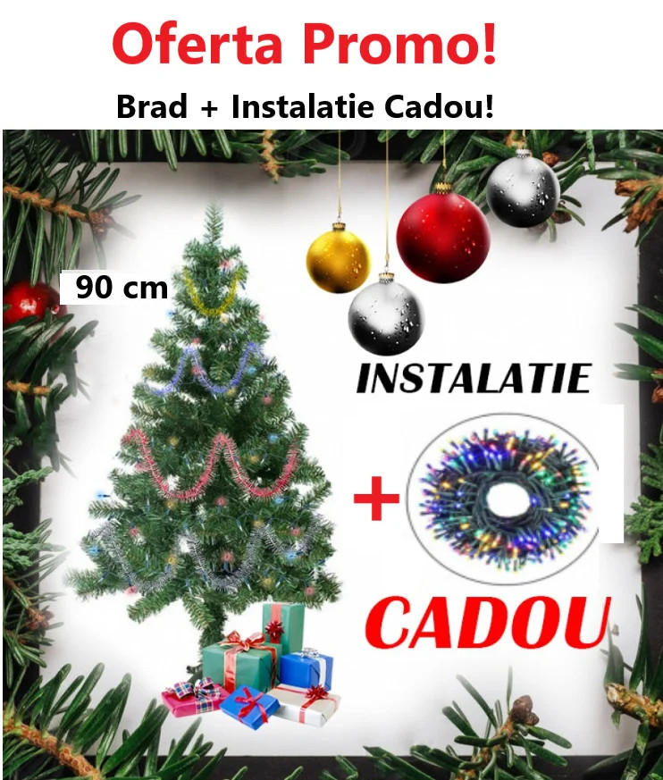 Oferta Brad Artificial de Craciun 90 cm, Suport Inclus + Instalatie 100 Leduri Cadou