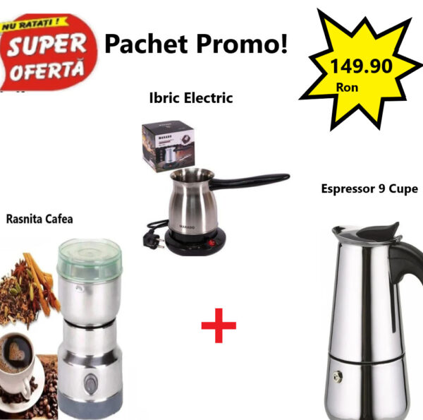 Pachet Promo 3 in 1 – Rasnita Electrica din Inox, 150W, Pentru Cafea + Ibric Electric de Cafea Marado + Espressor Cafea Pentru Aragaz, Capacitate 9 cesti