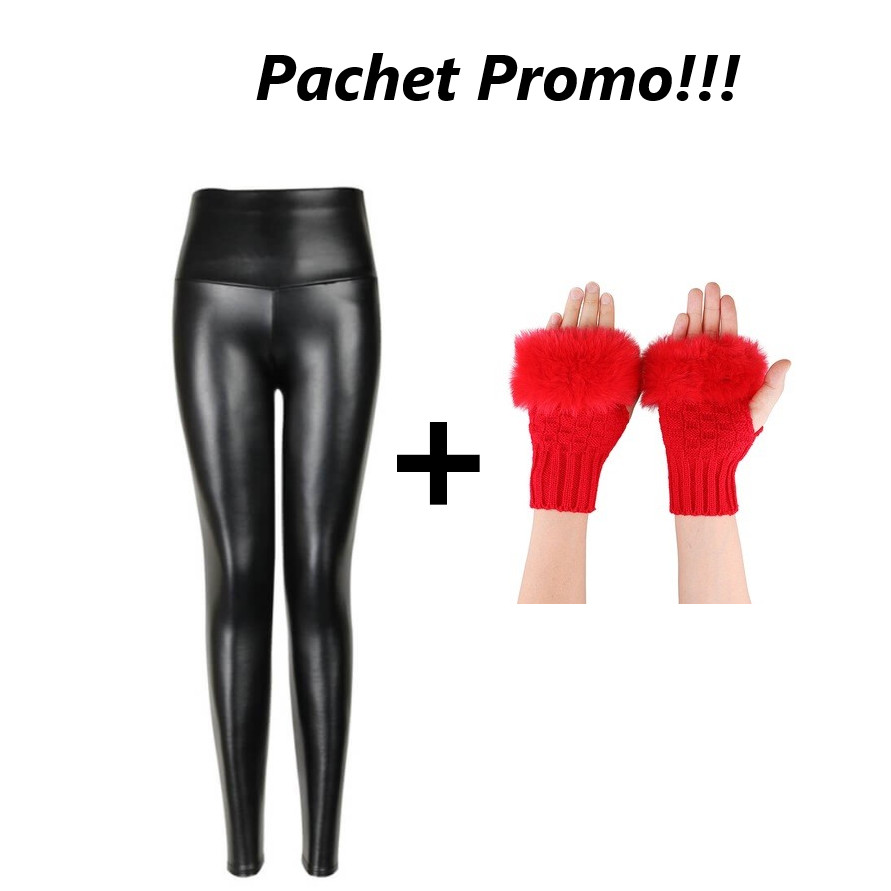 Oferta Promo 2 Bucati x Colanti Legging Slim Fit cu Banda Ridicata in Jurul Taliei, Colanti de Dama, Culoare Neagra, Diverse Marimi + Manusi Tricotate, Pentru Incheietura, cu Blanita, Rosii
