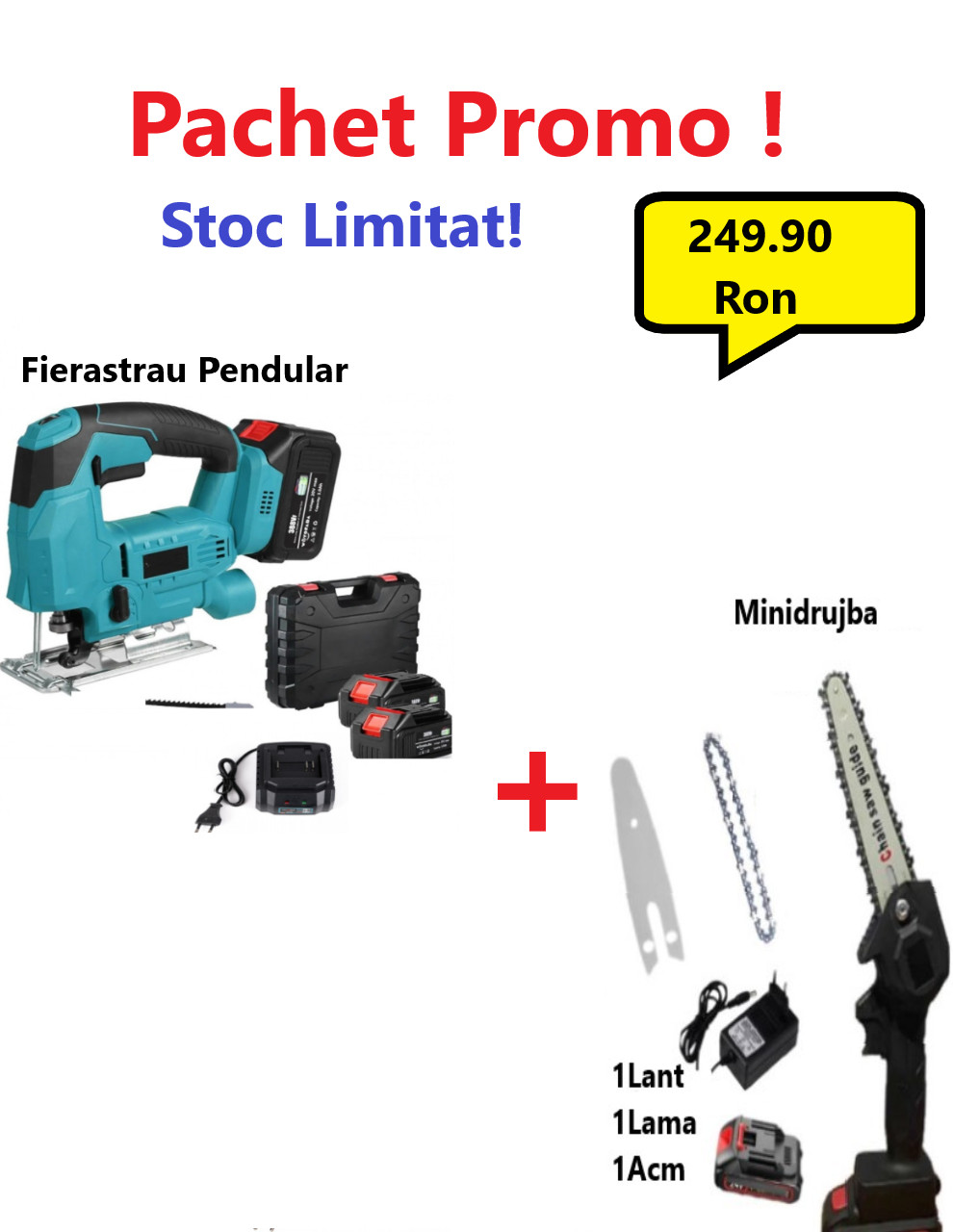 Pachet Promo!!! Fierastrau Pendular cu 2 Acumulatori, 18V, 3000mAh + Mini Drujba Fierastrau, Complet Echipata cu Lant, Lama, Acumulator