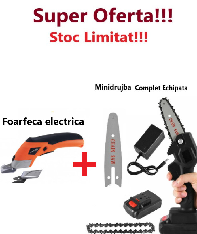 Pachet Promo – Foarfeca cu Acumulator, Multi Cutter cu Geanta de Transport + Mini Drujba Fierastrau complet Echipata