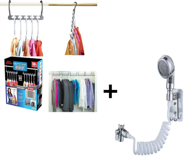 Pachet Promo – Suport Depozitare si Organizare Pentru 30 Umerase + Extensie dus cu Para Furtun flexibil si suport de perete pentru robinet de chiuveta sau cada