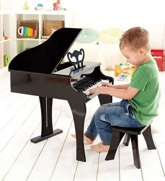 Poti da un adevarat concert folosind acest pian vesel, care iti va colora sufletul. Ai 30 de clape la dispozitie, perfecte pentru manutele tale mici, dar cu care vei putea scoate mari opere muzicale. Nu te feri sa acompaniezi sunetele pianului cu vocea ta! Caracteristici generale: Este ideal pentru dezvoltarea abilitatilor muzicale, a dexteritatii si a coordonarii ochi mana; Abilitatile pe care le dezvolta: coordonarea miscarilor mana-ochi, dezovoltarea musculaturii, invatarea prin propriile experiente vizuale, tactile si auditive, dezvoltarea abilitatilor de comunicare, cooperare, colaborare, intareste increderea in sine, prietenia si dezvolta limbajul; Chiar daca nu toti copiii care iau lectii de pian vor avea o cariera muzicala, exista o serie de avantaje pe care aceste cursuri le aduc in dezvoltarea copilului. 1. Este stimulata sensibilitatea auditiva. Daca lectiile de pian incep de la varste cat mai mici, copilul isi poate imbunatati auzul muzical, care ii permite perceperea diferentiata a ritmurilor si intensitatilor sunetelor. 2. Copilul isi dezvolta motricitatea fina. Miscarile degetelor pe clapele pianului ii dezvolta copilului capacitatea de a realiza miscari fine, viteza si precizia cu care le realizeaza, precum si coordonarea dintre cele doua maini. Acest lucru il va ajuta in toate situatiile in care ii va fi solicitata coordonarea ochi-mana. 3. Copilul invata despre rabdare si perseverenta. Desi la prima vedere pare simplu, a canta la pian este rezultatul orelor intregi de exercitii repetate in fiecare zi. Copiii care iau lectii de pian invata ce inseamna disciplina unui efort constant, ce inseamna sa nu renunti chiar daca pare imposibil si sa te bucuri de faptul ca prin perseverenta ai reusit un lucru pe care nu il credeai posibil. Aceste “lectii” suplimentare il vor invata pe copil sa munceasca pentru a obtine succesul si in alte domenii. 4. Sunt stimulate atentia si memoria. Deoarece copilul este nevoit sa realizeze miscari diferite cu cele doua maini si sa urmareasca partituri din ce in ce mai complexe, capacitatea sa de concentrare a atentiei va creste foarte mult. De asemenea, memoria de lucru, cea care se ocupa de pastrarea informatiilor de care avem nevoie pentru a finaliza o sarcina, este imbunatatita prin intermediul lectiilor de pian. 5. Creste stima de sine. Asa cum am spus mai sus, a invata sa canti la pian presupune efort si perseverenta. Reusind sa faca acest lucru, copilul va invata ca este capabil sa realizeze lucruri dificile, iar stima sa de sine va creste considerabil. 6. Spiritul de competitie este dezvoltat. Copiii care depun efort si au talent muzical, ajung sa participe la competitii muzicale, unde nivelul lor de pregatire este evaluat si recompensat. A face fata cu succes unei situatii de competitie este o abilitate care ii va fi de folos in toate situatiile de examen pe care le va intalni. 7. Cultura generala ii va fi imbogatita. Lectiile de pian presupun si invatarea detaliilor despre viata compozitorilor, despre contextul social si istoric in care acestia au trait. De asemenea, copilul va lua contact cu un gen de muzica pe care cei mai multi oameni il descopera abia la varste mai mari sau poate niciodata. Specificatii: Materiale: lemn, metal, ABS, vopsea pe baza de apa; Lungime: 48 cm; Latime (punctul scurt): 30 cm; Latime (punctul lung): 43 cm; Culoare: Negru. Mentiune: Vanzatorul face eforturi permanente pentru a pastra acuratetea informatiilor din acesta pagina. Rareori acestea pot contine inadvertente: fotografia are caracter informativ si poate contine accesorii neincluse in pachetele standard, unele specificatii sau pretul, pot fi modificate de catre producator fara preaviz sau pot contine erori de operare. Toate promotiile prezente in site sunt valabile in limita stocului.