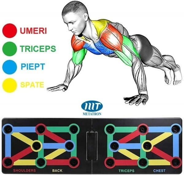 Placă fitness de antrenament pentru flotări, pe bază de culori, cu mânere, pentru muschi abdominali, piept, biceps, triceps, umeri, spate. Placa pentru flotari cu un cod de culoare Push Up este un sistem inovator de antrenament la bord care vă întărește și modelează întregul corp superior (piept, umeri, spate și brațe) în timp ce vă învăluie nucleul total. Acest sistem push up board combină presiunea de rezistență cu arderea cardio-intensivă a caloriilor, pliometria și exercițiile de bază pentru un antrenament total al corpului. În doar 30 de minute pe zi, vei dezvolta mușchii, vei construi forța superioară și inferioară a corpului, vei arde calorii și vei pierde în greutate. Caracteristici Push Up Board: 1. caracteristica principală este pliabilă. Economisește spațiul de ambalare. Cu alte cuvinte, economisește costul transportului. 2. Placa de împingere cu cod de culoare vizează diferiți mușchi lucrați (piept albastru, umeri roșii, spate galben și triceps verde) 3. Placa de sistem “Plug & Press” pentru serviciu greu împinge în sus cu diferite poziții și unghiuri care sculptează și maximizează definiția corpului superior 4. ardeți calorii și construiți forța cu acest sistem inovator de flexie, care vă duce printr-un antrenament total de forță și condiționare. 5. asamblare portabilă, simplă și ușor de depozitat 6. Strângeri de mână amortizate premium. Este destinat atit pentru barbati cat si pentru femei. Antrenament ușor și rapid pentru un corp tonifiat * Mentiune: Vanzatorul face eforturi permanente pentru a pastra acuratetea informatiilor din acesta pagina. Rareori acestea pot contine inadvertente: fotografia are caracter informativ si poate contine accesorii neincluse in pachetele standard, unele specificatii sau pretul, pot fi modificate de catre producator fara preaviz sau pot contine erori de operare. Toate promotiile prezente in site sunt valabile in limita stocului.