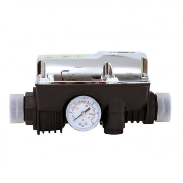 Descriere produs Prescontrolul sau presostatul electronic e un dispozitiv nou ce caranteaza protectia si controlul optim al pompelor de uz casnic. Prescontrolul automat detecteaza atat presiunea si debitul pompelor, cat si gestionarea automata a functionarii acestora. Prescontrolul este un utilaj universal si functioneaza atat pentru pompe de suprafata, cat si pentru cele submersibile. Cum functioneaza prescontrolul: Prescontrolul indica ca pompa este functionala si are curent atunci cand e aprinsa lumina verde Atunci cand pompa pompa incepe sa lucreze se aprinde lumina galbena. Pompa va continua sa functioneze timp de cateva minute pentru a permite sistemului sa completeze conductele, pentru a ajunge la presiunea necesara. Daca acest interval este insuficient, se va aprinde lumina rosie. In acest caz, lasati un robinet deschis si tineti butonul Restart apasat pana cand lumina rosie se stinge. Din acest moment, presostatul va pastra pompa la presiune maxima. Specificatii tehnice – Voltaj 220-240V – Curent maxim 10 A – Frecventa: 50/60 Hz – Protectie umiditate IP65 – Temperatura maxima a apei 60 de grade Celsius – Presiunea maxima de utilizarea 10 bari Mentiune: Vanzatorul face eforturi permanente pentru a pastra acuratetea informatiilor din acesta pagina. Rareori acestea pot contine inadvertente: Imaginile folosite si textele de pe SITE au caracter informativ și pot varia sau diferi ocazional față de caracteristicile produselor prezentate. Toate promotiile prezente in site sunt valabile in limita stocului.