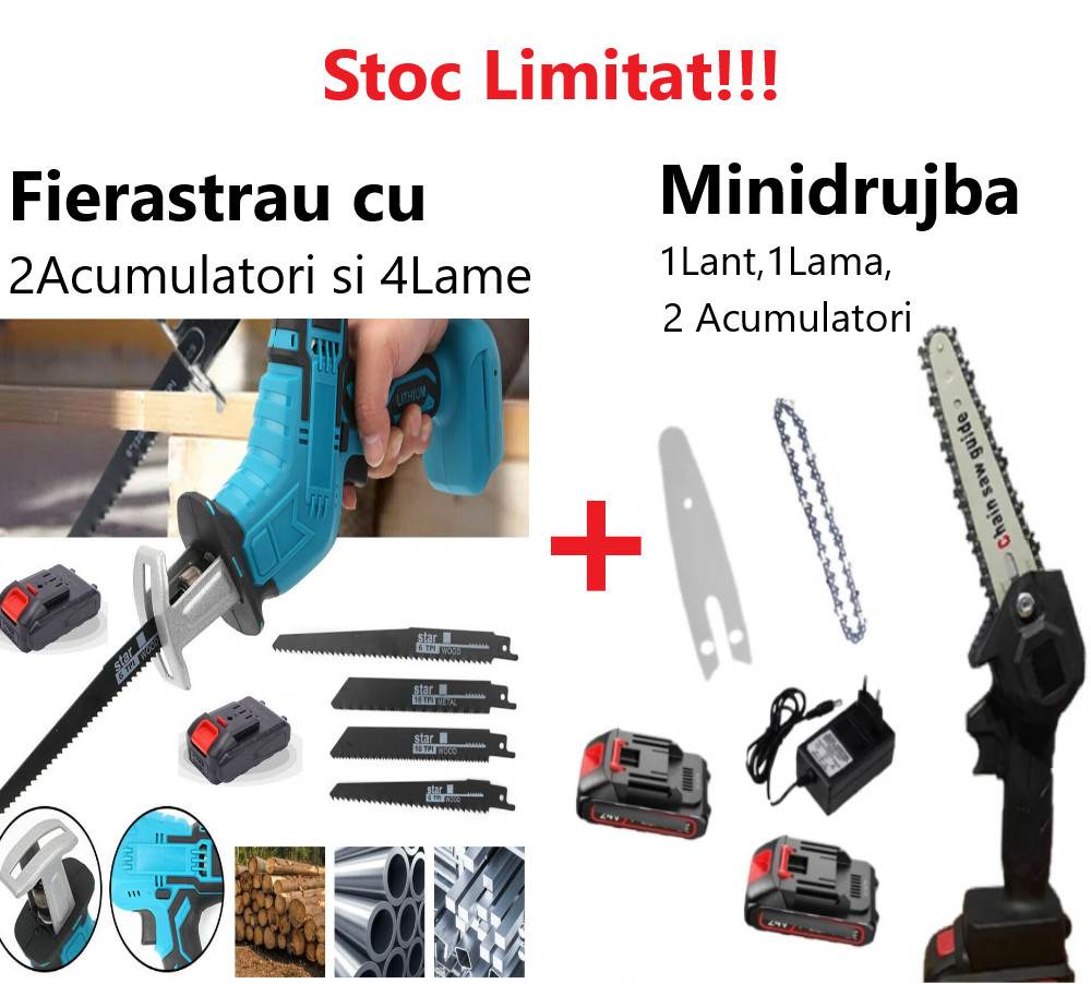 Promo !!! Fierăstrău Tip Sabie, Soricel Fără Fir Pentru Taiat si Toaletat Gradina, cu 2 Acumulatori si 4 Lame Incluse + Mini Drujba Fierastrau cu lama de 15 cm, Complet Echipata cu 1Lant, 1 Lama, 2Acumulatori