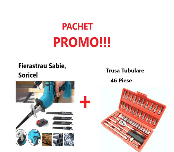 Promo!!! Fierăstrău Tip Sabie, Soricel Fără Fir Pentru Taiat si Toaletat Gradina, cu Acumulator si 4 Lame Incluse + Trusa Chei Tubulare si Biti, 46 Piese, Maner cu clichet 1/4