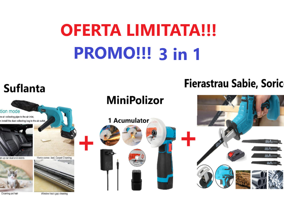Promo Limitat!!! Suflanta de Aer Electrica, Fara Fir, cu Acumulator, Maturator de Frunze + Mini Polizor Unghiular cu 2 Acumulatori + Fierăstrău Tip Sabie, Soricel cu 1 Acumulator si 4 Lame Incluse