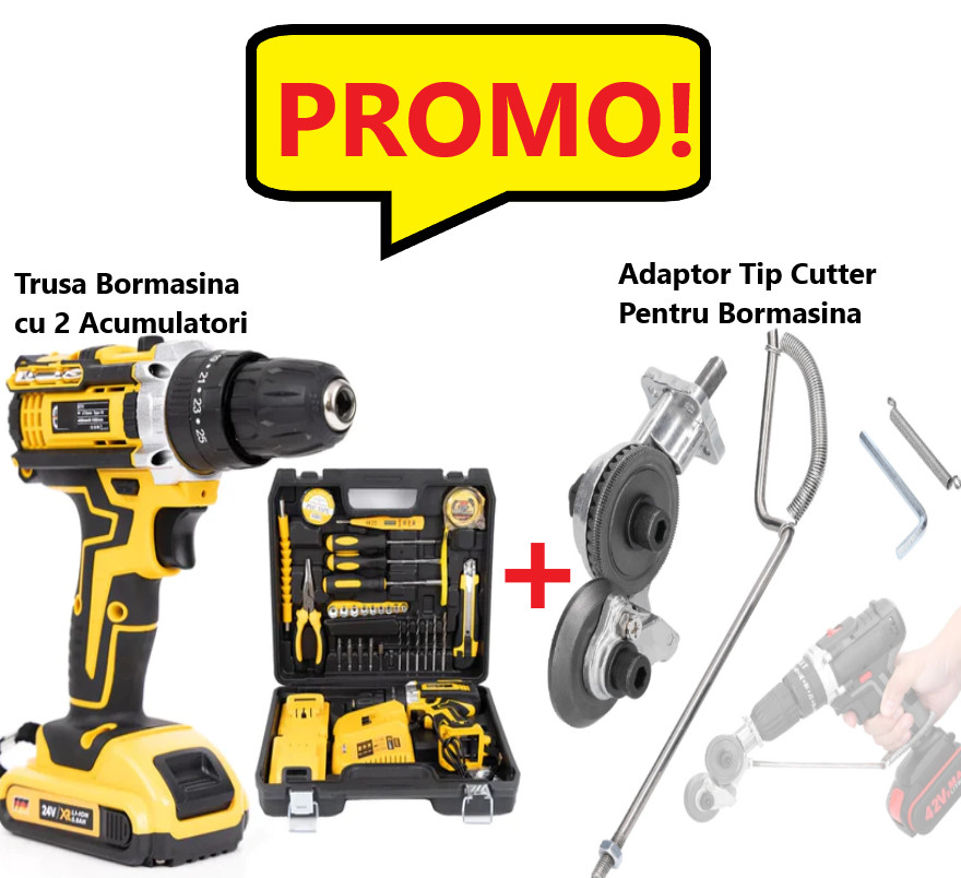 Promo!!! Trusa Bormasina, Masina de Gaurit si Insurubat cu 2 Acumulatori si Multiple Accesorii + Adaptor Tip Cutter de Taiat Tabla Pentru Bormasina + Foarfeca cu Acumulator, Multi Cutter
