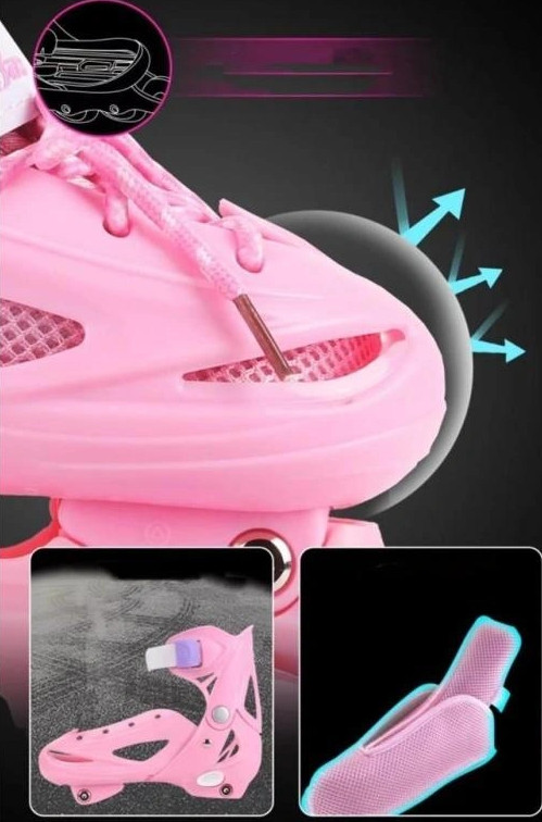 Un cadou minunat pentru toti copii care adora sa se plimbe cu rolele! Un set ideal, cu un design original si foarte atragator! Plus intr-o gentuta, practica si usor de transportat, setul contine tot ce are nevoie copilul dumneavoastra pentru a se bucura de o plimbare pe role in conditii de siguranta si protectie: casca, cotiere, genunchiere si protectii pentru palme. Description: Role copii R05, masuri reglabile 26 – 33, roz Copilul tau vrea sa invete sa mearga cu rolele? Acesta este un produs special pentru incepatori. Rolele sunt reglabile pe 4 numere / masura: piciorul creste, la fel si rolele! Masuri disponibile reglabile: S: 30 – 33 Caracteristici: Roti de 45 mm, din cauciuc siliconat Rulmenti ABEC-5 ghete inalte – piciorul este bine sustinut material – piele ecologica si material textil, perforat, care lasa piciorul sa respire incheiere cu sireturi, curea cu velcro (scai) si catarama dublu securizata din plastic frana pe fata reglarea pe numere se face prin apasarea pe butonul din partea din spate de pe gheata Rolele sunt usoare, fiind usor de utilizat pentru incepatori, gheata este inalta pentru o mai buna sustinere a piciorului, este confectionata din piele ecologica si material textil, sunt dotate cu frana pe partea din fata. Inchiderea se face cu sireturi, curea Velcro si catarama dublu securizata pentru o mai buna sustinere a piciorului in timpul rularii. In functie de cum sunt asezate rotile, unele se vor uza mai repede decat celelalte, de aceea este indicat sa le schimbati intre ele pentru ca uzura sa fie uniforma. Se recomanda purtarea unui echipament de siguranta pentru a fi protejati in caz de cadere. Marimi: 30-33. Nr de jucători recomandat: 1. Culoare: roz. Mentiune: Vanzatorul face eforturi permanente pentru a pastra acuratetea informatiilor din acesta pagina. Rareori acestea pot contine inadvertente: Imaginile folosite si textele de pe SITE au caracter informativ și pot varia sau diferi ocazional față de caracteristicile produselor prezentate. Toate promotiile prezente in site sunt valabile in limita stocului.