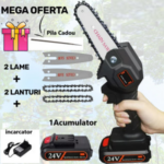 Super Oferta – Mini Drujba Fierastrau, complet echipata, cu 2Lame, 2Lanturi, 1Acumulator si incarcator + 1 Pila de Ascutit CADOU!