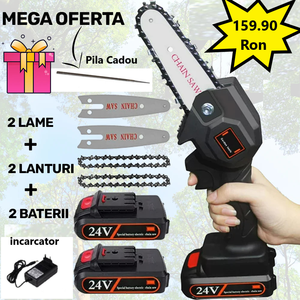 Super Oferta - Mini Drujba Fierastrau, complet echipata, cu 1Lama, 1Lant, 1Acumulator si incarcator + 1 Pila de Ascutit CADOU!